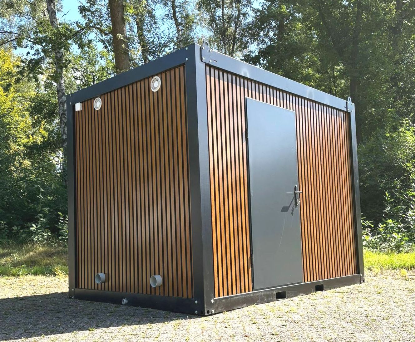 Waste needs to be connected to a sewer system and gets fresh water from an outside source. Connection for many time is possible.